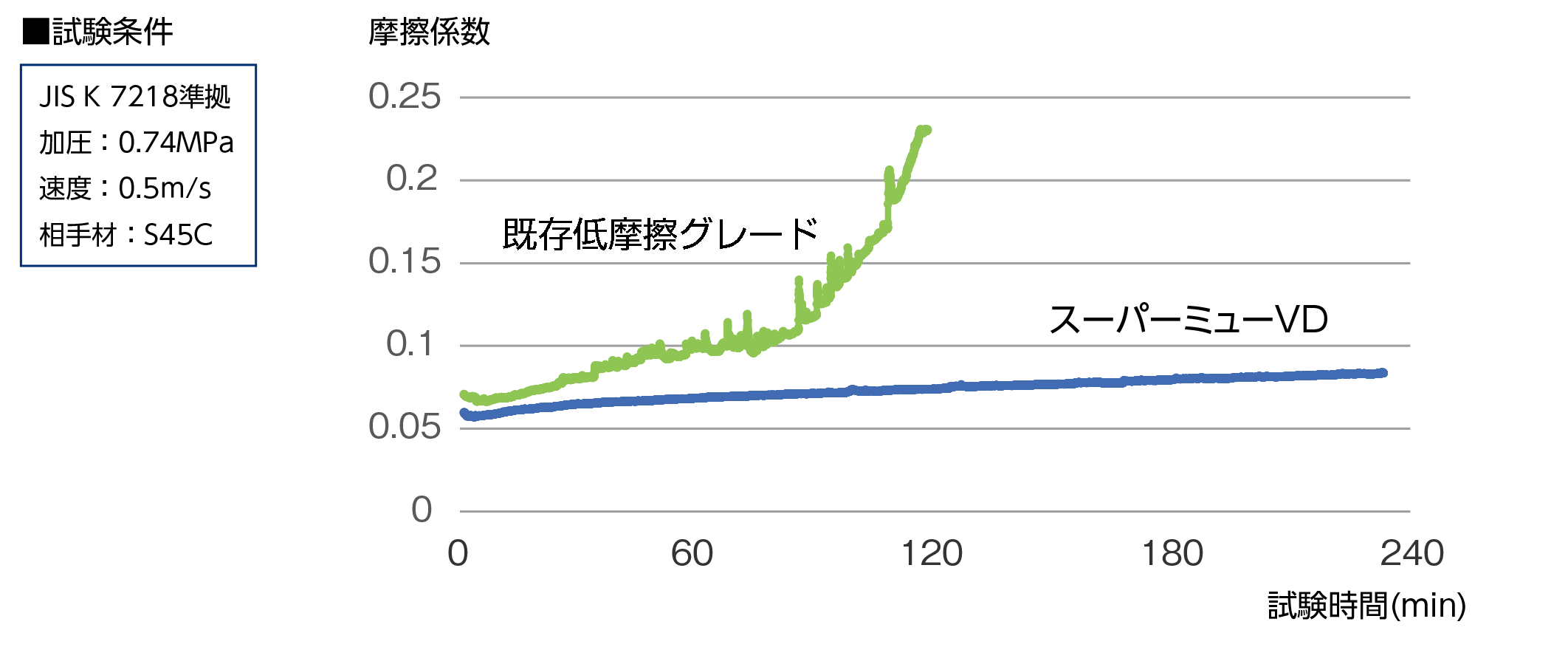 NL-スーパーミューVDは、ポリ四フッ化エチレン(PTFE)並みの低摩擦性を有し、約12倍の耐摩耗性があります。従来の低摩耗グレードと比べ耐久性(低摩擦特性の持続)が大幅に向上しています。
