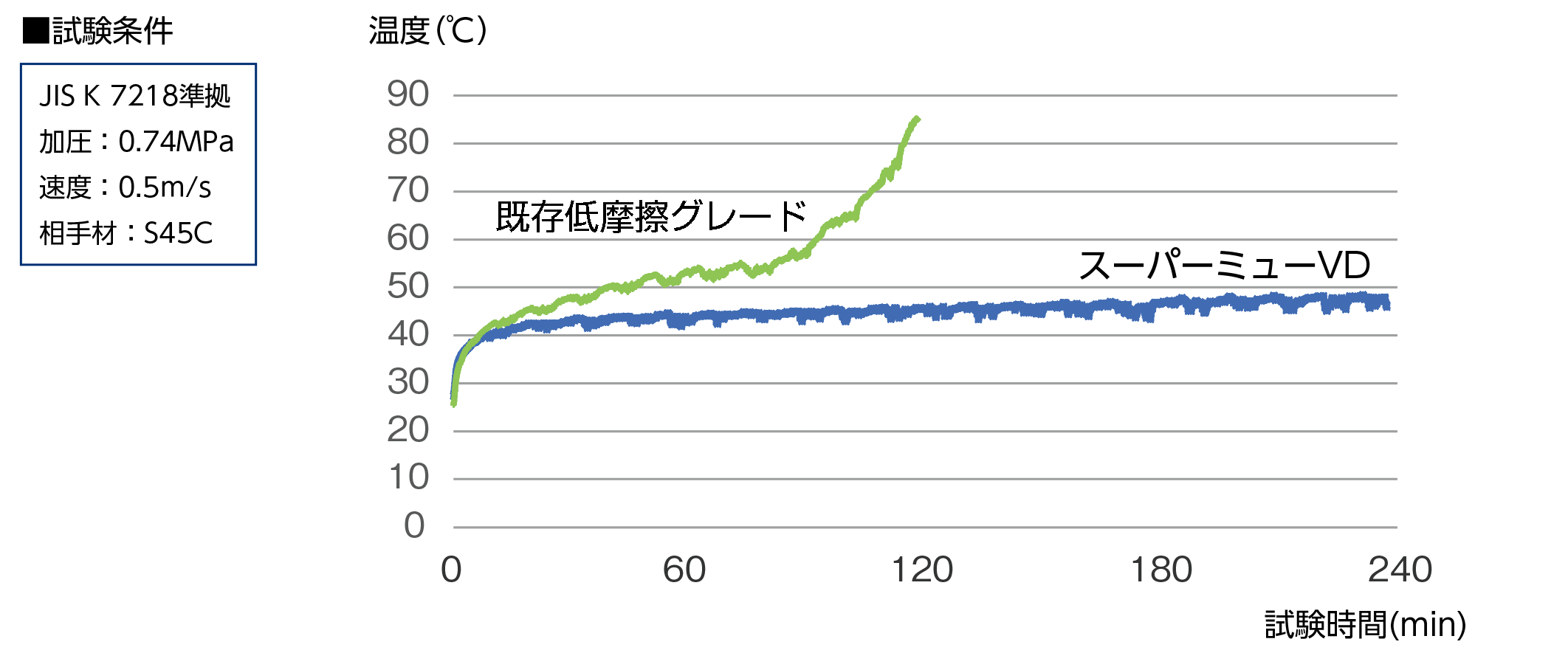 厳しい摩擦摩耗試験下においても、摩擦熱の発生による温度上昇を低減します。
